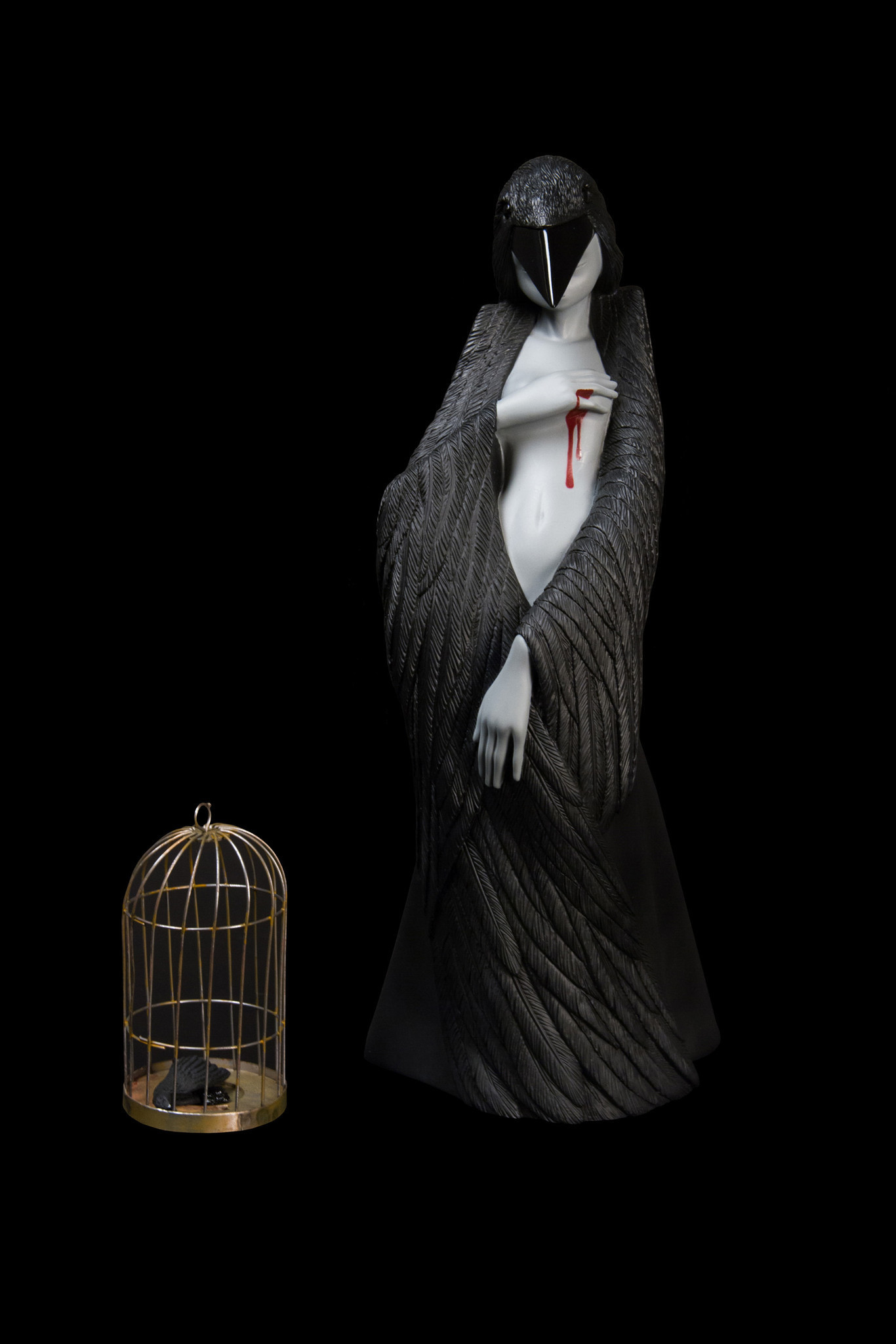 Massive hands hold the delicate chest. Bright, shining red escapes through the pointed digits – a sign of life in a sea of black. In the aftermath of an unknown event stands a 12-inch vinyl statuette. A lost life in a small metal cage lies at her feet with no explanation given.