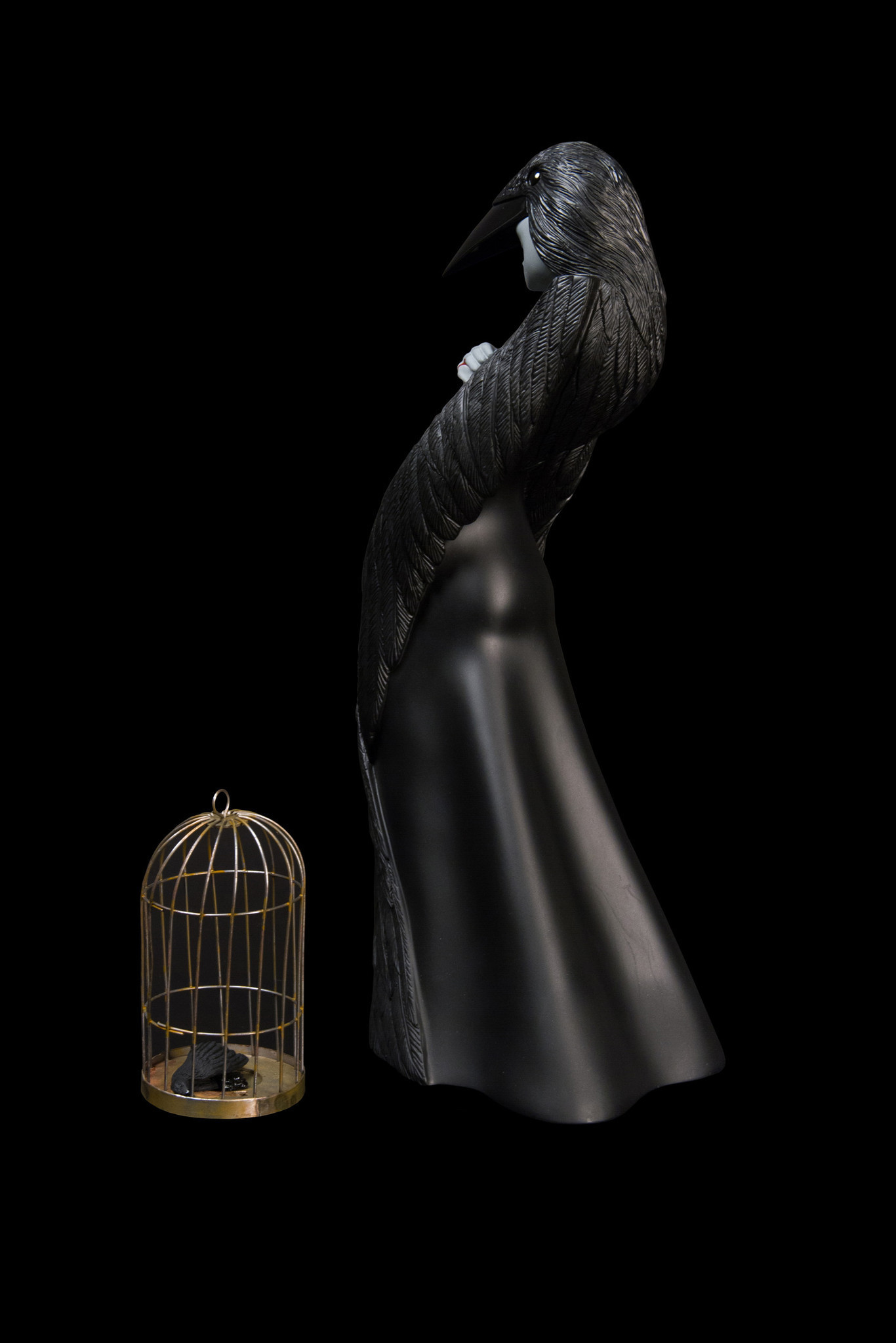 Melancholic beauty and death cloaked in feathers. A headdress with shiny black eyes and sharp beak is mounted over petite downcast features.