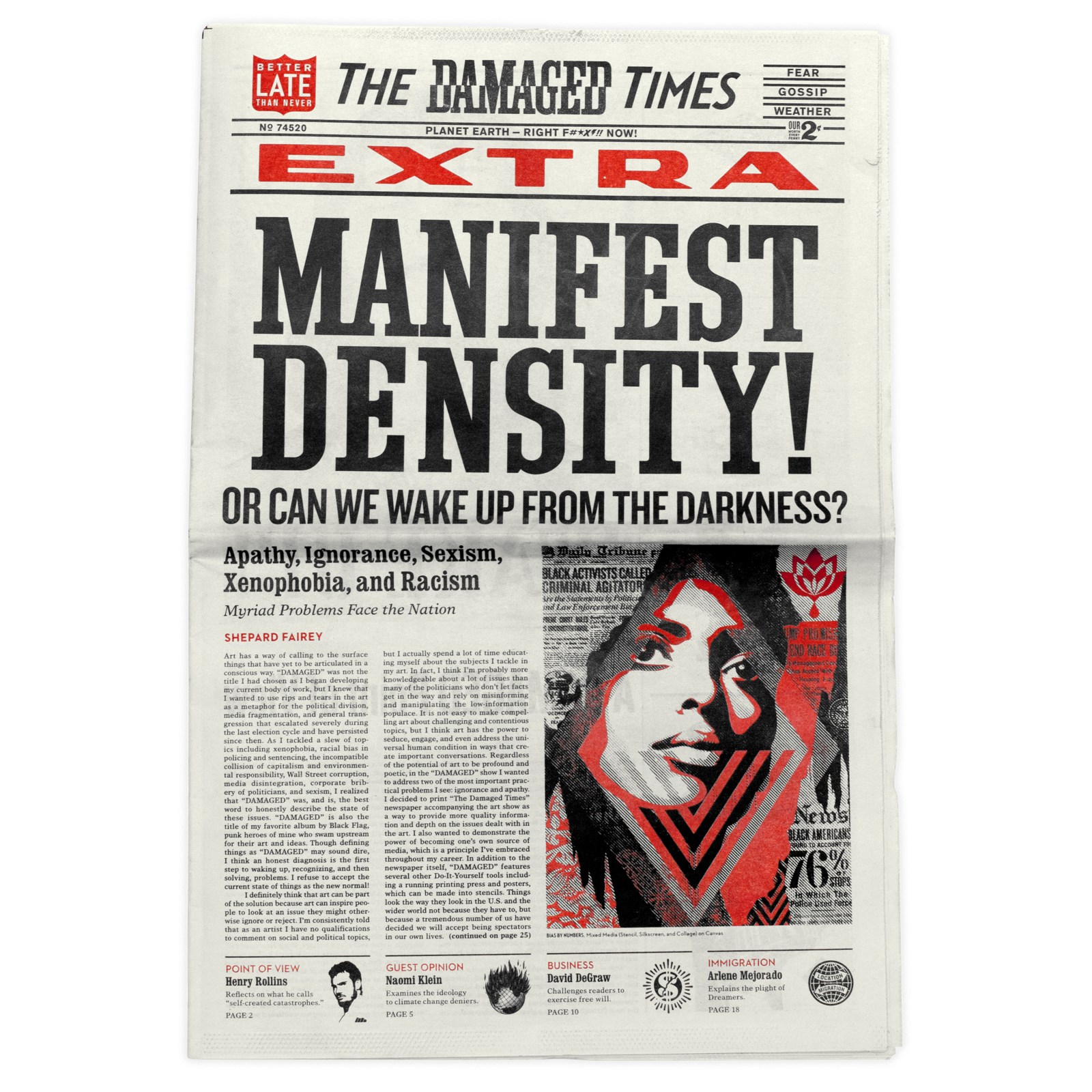 I’d like to thank Juxtapoz and Henry Rollins, Naomi Klein, David Degraw, Arlene Mejorado, Gwynn Vitello, Victoria Yarnish, Fredrika Newton Evan Pricco, Stephen Serrato, and Simon Steinhardt for contributing. My newspaper flips the standard model by having REAL news and FAKE ads! If you don’t like the deterioration of mass media, be the media yourself!" – Shepard