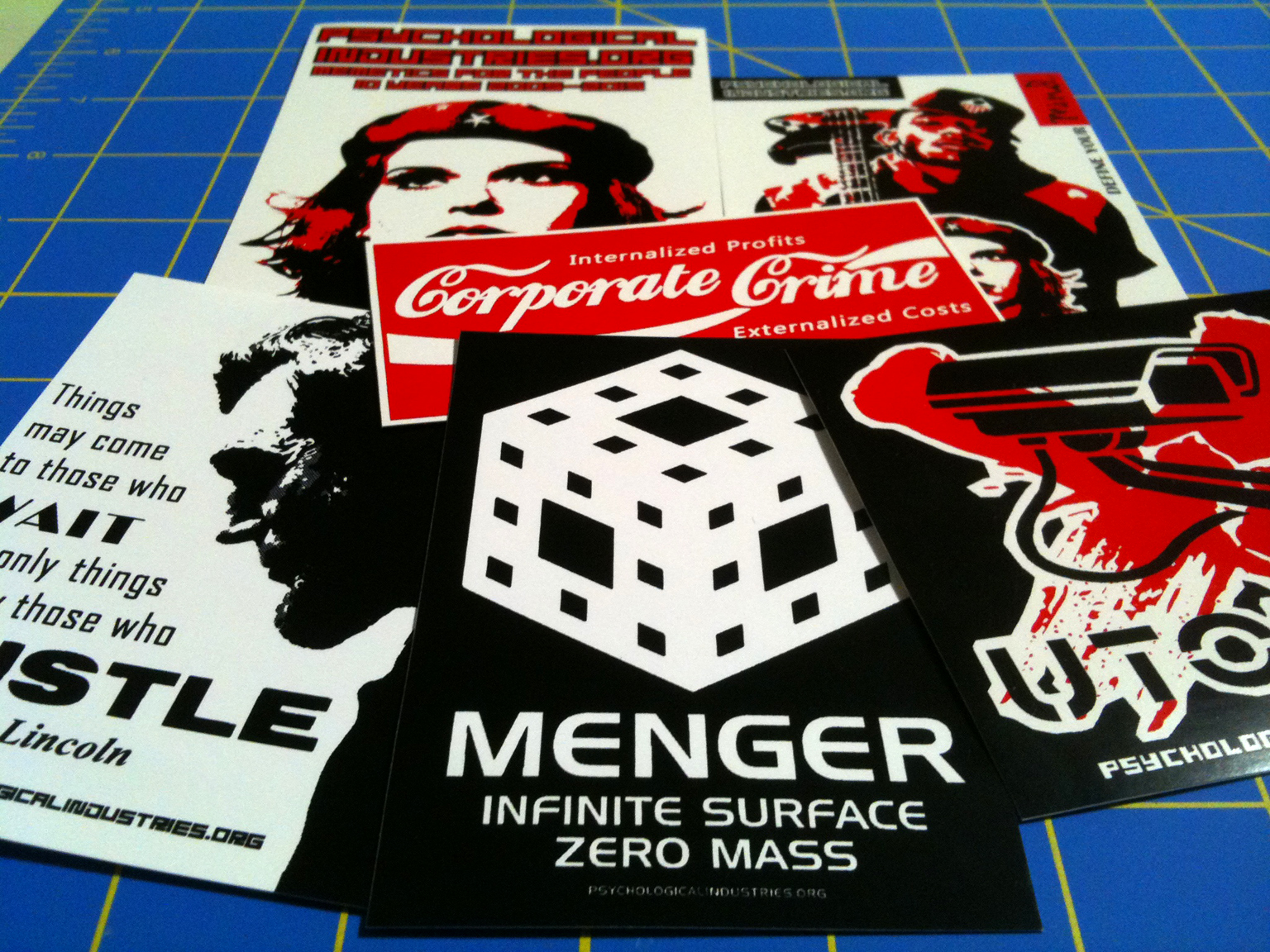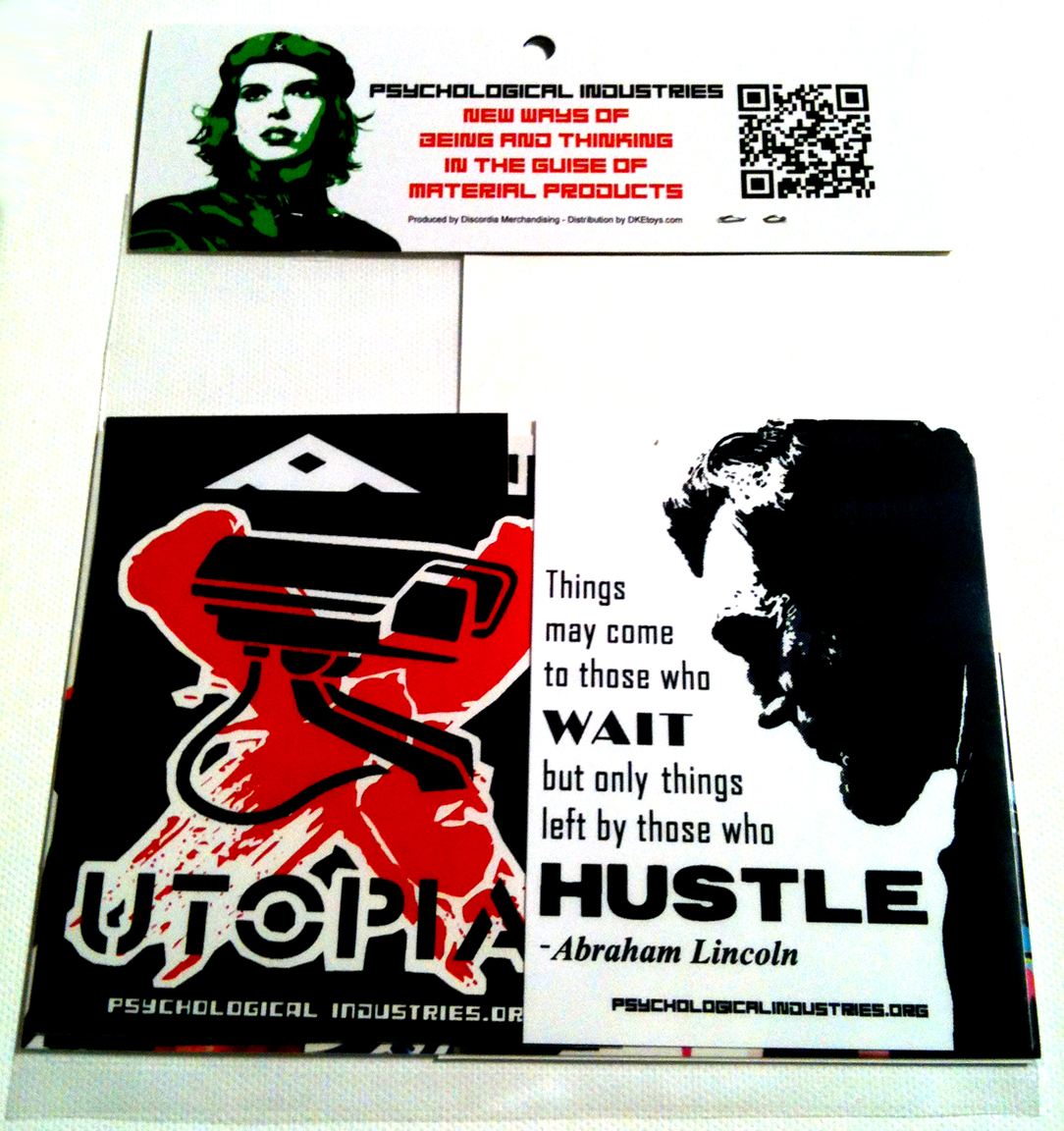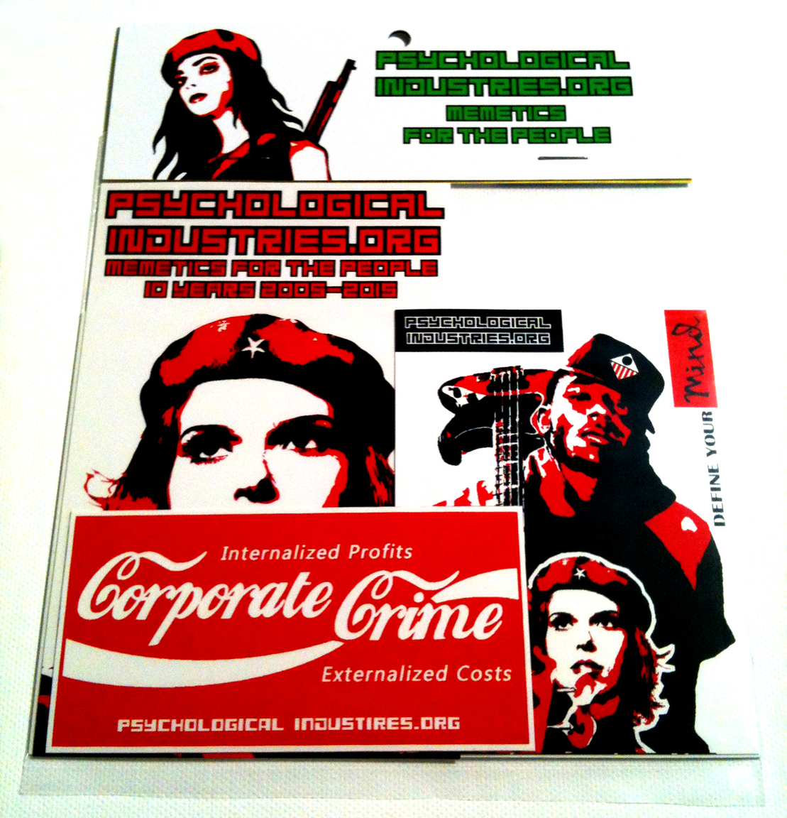 Celebrating Psychological Industries 10th year. The 10 Year Hustle Vinyl Sticker Pack contains all new designs engaging in memetic and agit-prop elucidation.