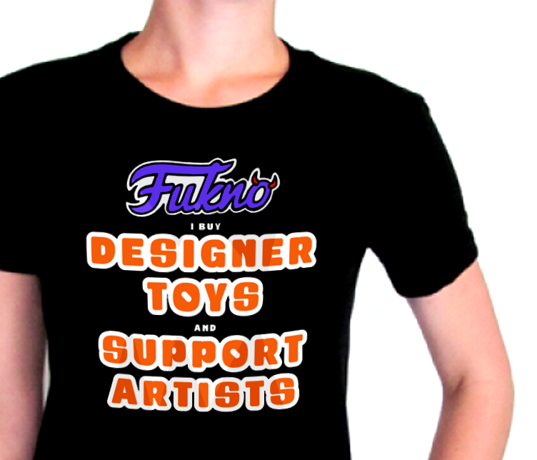 Shirt Reads, "FUKNO I Buy DESIGNER TOYS and SUPPORT ARTISTS"