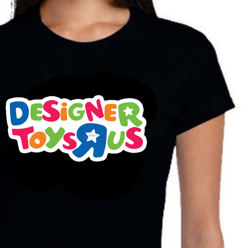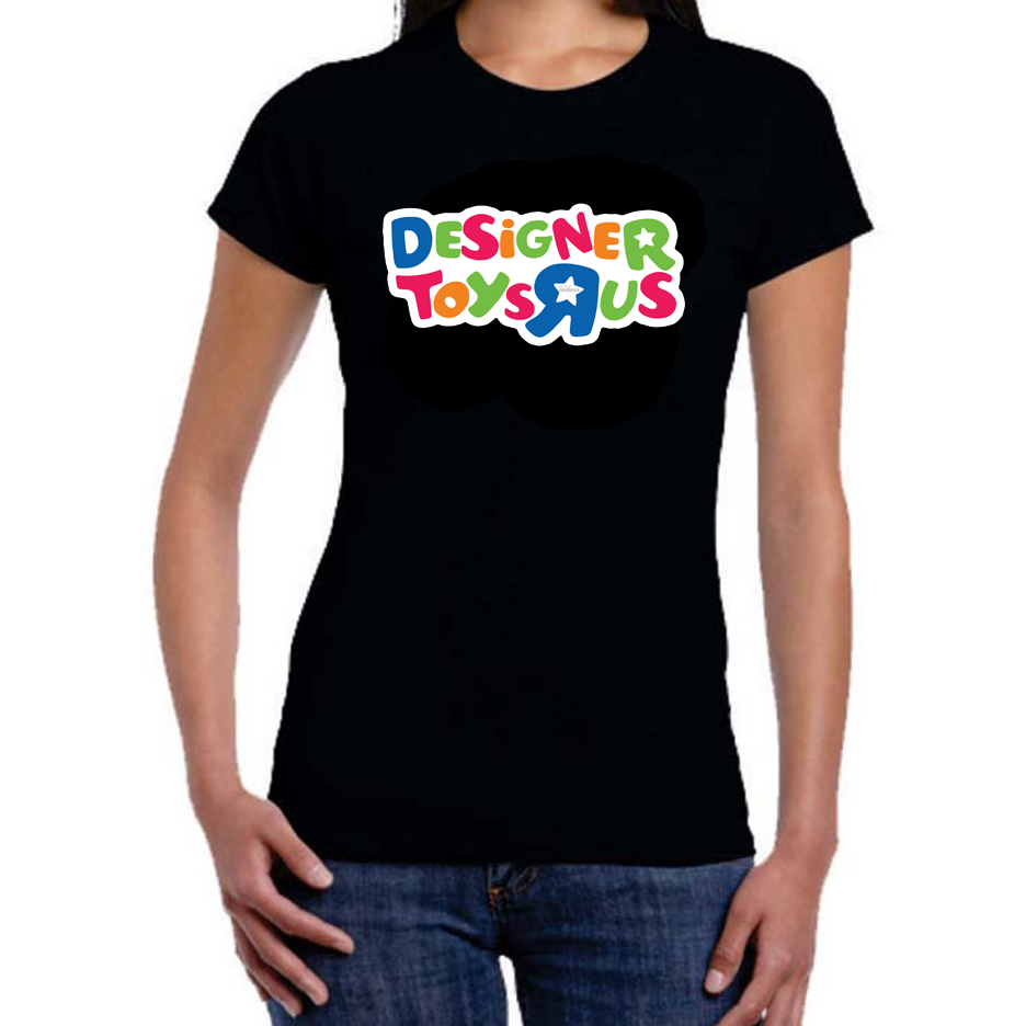 Designer Toys R Us design on Bella Ladies Short Sleeve Jersey Black T-Shirt. Front printing in sizes S,M,L,XL,2XL