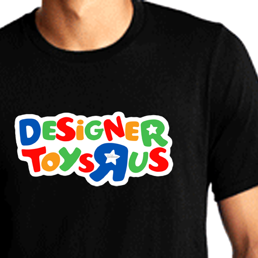 Designer Toys R Us on Unisex Gildan Ultra Cotton Black T-Shirt. Front printing in sizes S,M,L,XL,2XL,3XL,4XL,5XL