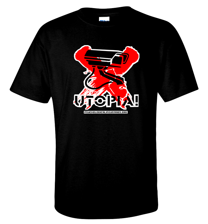 UTOPIA X on Unisex Gildan Ultra Cotton Black T-Shirt. Front printing in sizes S,M,L,XL,2XL,3XL,4XL,5XL